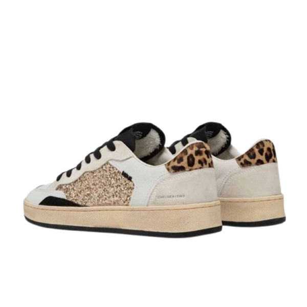 Tomaia in pelle bianca con glitter oro, dettagli in suede nero