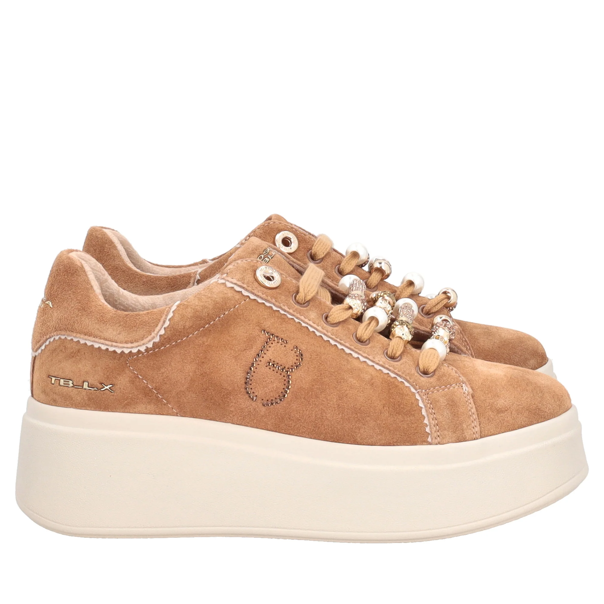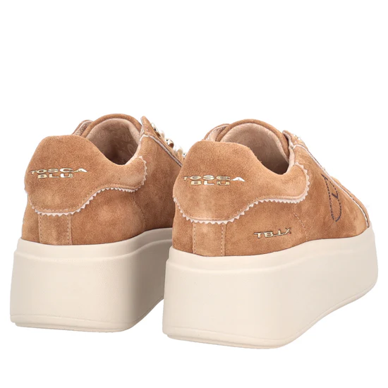 Realizzate in morbida pelle scamosciata color cuoio, si distinguono grazie ai luminosi dettagli che impreziosiscono i lacci. Confortevoli grazie alla silhouette con plateau, queste scarpe sono rifinite in ogni dettaglio, come il monogramma Tosca Blu cucito sulla tomaia e il logo stampato a contrasto sulla linguetta. Perfette con pantaloni cropped o gonne midi, le sneakers in suede con charm aggiungono un tocco sofisticato anche al look più casual, dall’ufficio al weekend fuori porta.